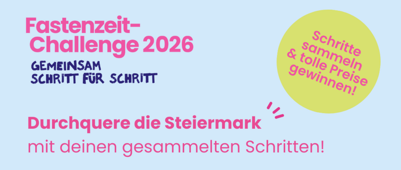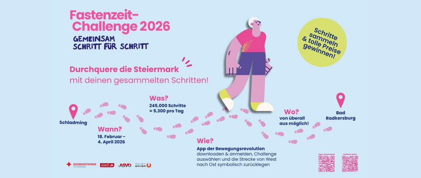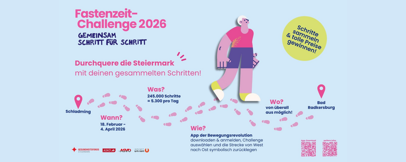 In der Zeit zwischen 18. Februar und 4. April heißt es heuer: Schritte sammeln! Gemeinsam wollen wir durch tägliche Bewegung symbolisch die Steiermark durchqueren, ob von West nach Ost oder von Nord nach Süd. Ziel ist es, über den Zeitraum verteilt so viele Schritte zu sammeln, dass die gesamte Strecke virtuell zurückgelegt wird.